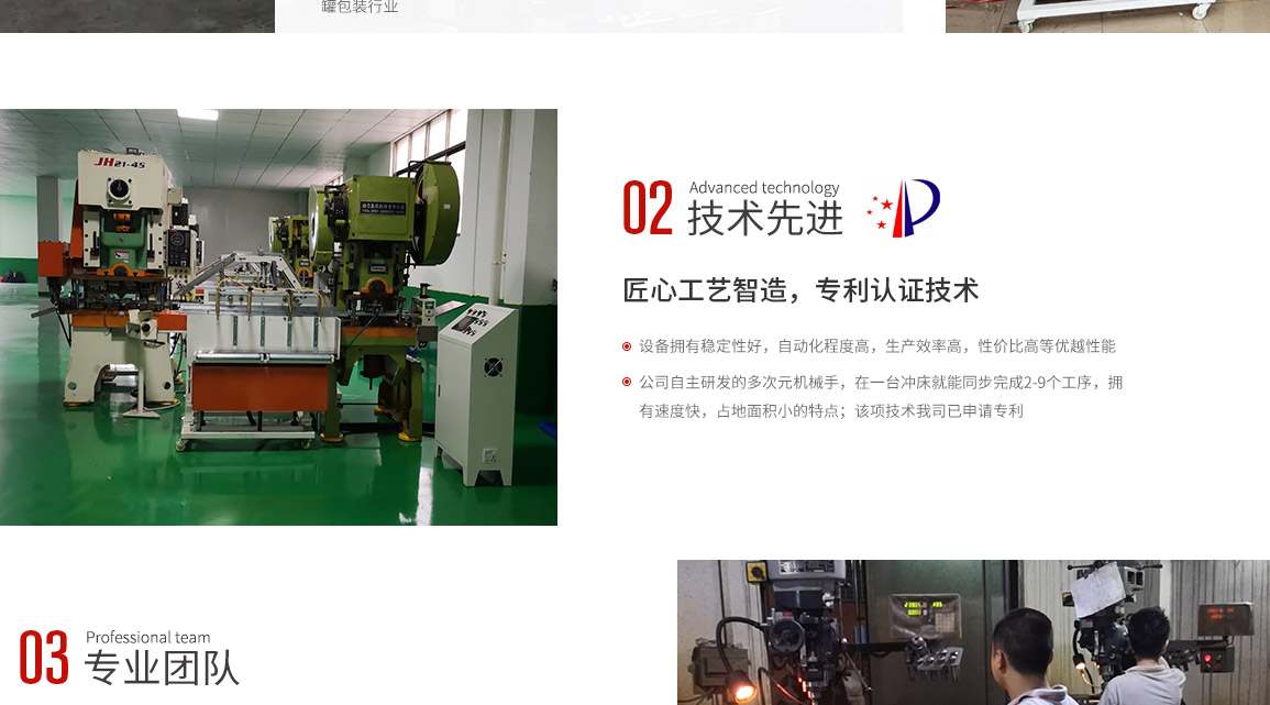 罐身自動(dòng)扣骨機(jī)生產(chǎn):茶葉罐/酒罐/化妝品罐/內(nèi)衣罐等等. 其中多次元機(jī)械手專(zhuān)為兩片盒的生產(chǎn)和三片罐的蓋、底、蓋圈、拍底蓋等的生產(chǎn)而設(shè)計(jì),...
